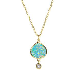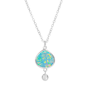 Fun, elegant, and colorful, this lab-created 10mm pear shaped opal pendant has a 3mm bezeled crystal drop. The green opal is bold and glowing, picking up different rainbow colors in the light. It is set in 925 Sterling silver with gold plate. The 18 inch chain is Sterling silver with an adjustable slider ball so it can be shortened to any length! Wear it on its own, or layer Best Friend with our other lab-created opal necklaces.