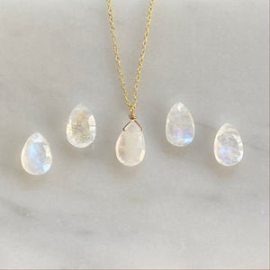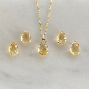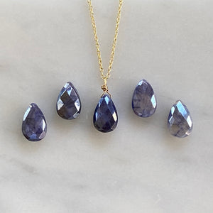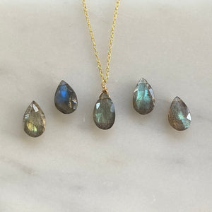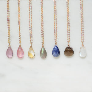 Stunning one-of-a-kind gemstone briolette drop on chain! This is the perfect pop of color that goes with any outfit. Each necklace has a genuine gemstone on an 18-inch chain with an adjustable slider, meaning it can shortened to any length. Sterling silver base with 14k gold plating. Select your favorite gemstone: