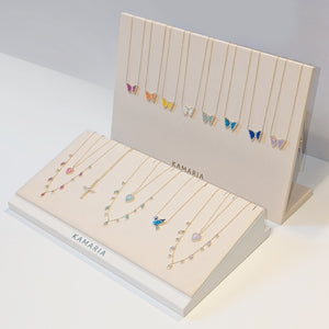 Beautiful jewelry displays for your KAMARIA pieces! Each one ins in a soft suede fabric and comes with our branding logo in a gold tone. The ramps are perfect for showcases, table top displays, and shelves. There is a pocket in the back that holds the chain for easy transport and to prevent tangling. The standing boards also have pins in the back to keep the chain in place. Jewelry is not included.