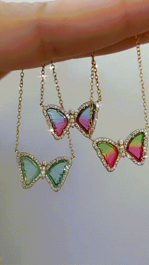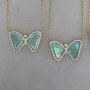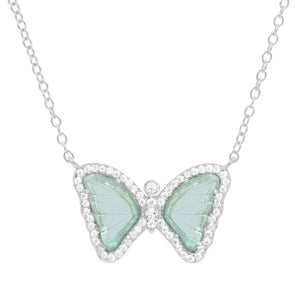 Wow, we love this mini butterfly necklace in aqua green. Green butterflies are said to bring goodness, love, and prosperity. This hand-carved, simulated aquamarine butterfly necklace is a stunner.