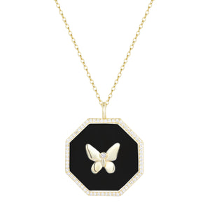 Beautiful octagon butterfly necklace with black enamel set in 925 Sterling silver and crystals accents.