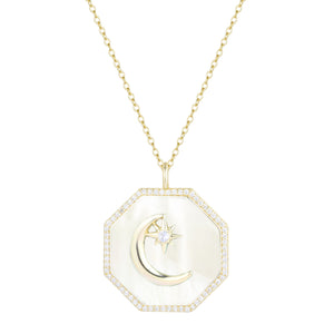 Beautiful octagon moon and star necklace with white mother-of-pearl set in 925 Sterling silver and crystals accents.