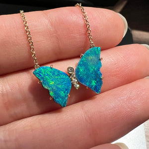 Opal Butterfly Necklace with Diamonds and Prongs - Blue Green