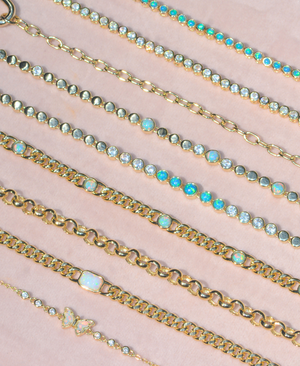 This bracelet pairs glowing round bezel-set opals with a classic curb chain for a look that’s both ethereal and grounded. The iridescent opals flash with hints of color as they catch the light, adding a touch of magic to the bold, structured links.