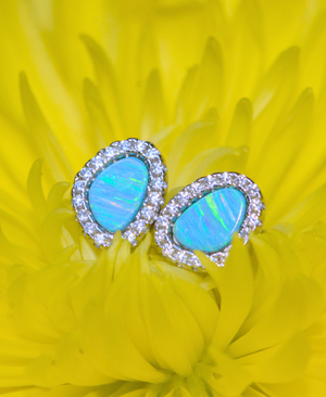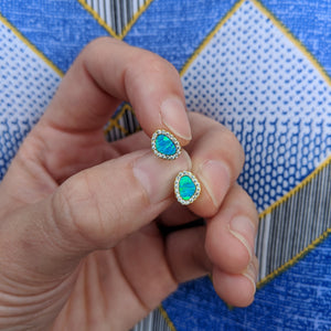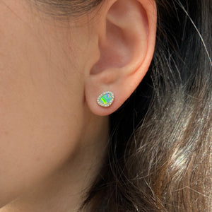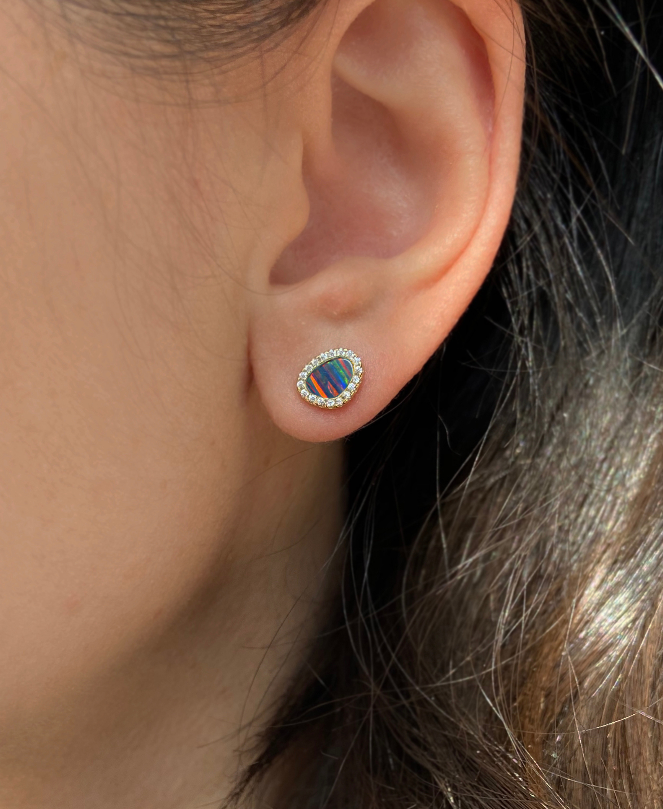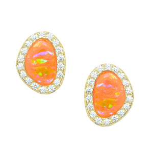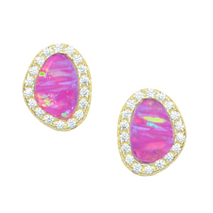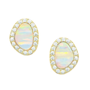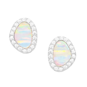 These pebble-inspired studs feature luminous lab-grown opals framed by a halo of brilliant cubic zirconia. The organic shape echoes the beauty of natural river stones, while the CZ accents add a refined touch of sparkle.