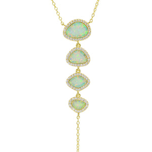 Four organic shapes of lab-created opal surrounded by pave crystal. This piece is a knock-out! You can dress it up or wear it casually for any occasion.