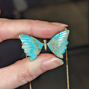 This stunning natural Turquoise Butterfly Necklace has natural veining and is set with mini diamonds just in the body! The turquoise has a bold, bright blue hue and soft tan tones. Butterflies represent hope and transformation.