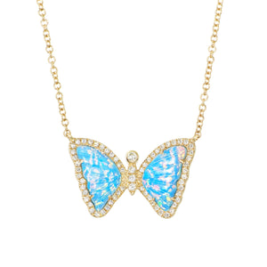 Stunning and magical, this lab-created Opal and turquoise doublet Butterfly Necklace is set with mini diamonds. It is a truly stunning piece. The diamonds add just the perfect amount of sparkle! The galaxy opal has hints of a blue, green, and red fire, a truly beautiful and unique color. Butterflies represent hope and transformation.
