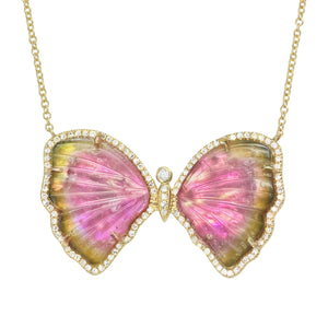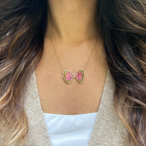Stunning and one-of-a-kind, this Watermelon Pink and Green Tourmaline and pearl Butterfly Necklace is set with a pearl backing and mini diamonds. It is a truly stunning piece. The pearl adds an iridescent glow, with the diamonds add just the perfect amount of sparkle!Butterflies represent hope and transformation.