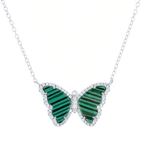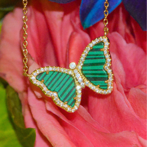 New! The most beautiful and delicate butterfly necklace is now available with lab-created malachite and set in 925 sterling silver. The butterfly wings are surrounded with pave crystal for an added sparkle. Butterflies represent hope, rebirth, and transformation. Pair this necklace with our crystal chokers or your favorite gold chain for a fun layered look. <3