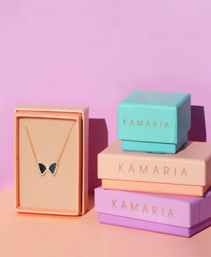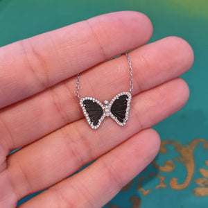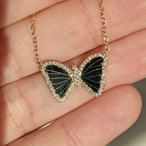 This Mini Butterfly Necklace in Black Onyx has hand-carved genuine black onyx butterfly wings set in gold-plated 925 sterling silver. Black butterflies are seen as symbols of positive change and new beginnings.