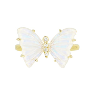 New! This is one of those rings you never seem to take off. Made with diamonds and solid 14k yellow gold, this ring is sweet, flirty, and sparkly. The rainbow has a soft sheen with light blue flashes in certain angles of light. Butterflies represent hope and transformation.This ring is a size 7. We can custom make this ring in any size. For a request, please email us at contact@kamaria.com.