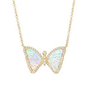 Stunning and magical, this lab-created Opal Butterfly Necklace is set with mini diamonds. It is a truly stunning piece. The diamonds add just the perfect amount of sparkle! The galaxy opal has hints of a blue, green, and red fire, a truly beautiful and unique color. Butterflies represent hope and transformation.
