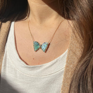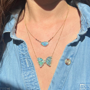 Stunning and one-of-a-kind, this Teal and Blue Tourmaline and pearl Butterfly Necklace is set with a pearl backing and mini diamonds. It is a truly stunning piece. The pearl adds an iridescent glow, with the diamonds add just the perfect amount of sparkle! Butterflies represent hope and transformation.