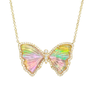 Stunning and one-of-a-kind, this Yellow and Pink Tourmaline Butterfly Necklace is set with a pearl backing and mini diamonds. It is a truly stunning piece. The pearl adds an iridescent glow, with the diamonds add just the perfect amount of sparkle! Butterflies represent hope and transformation.