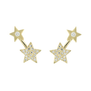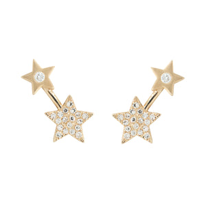 Double star diamond studs in 14kt gold. The smaller star has a brushed finish for an everyday look, but still sparkles with a diamond! The larger star has mini diamonds set in it for the ultimate sparkle. Wear them on their own, or with our other huggies and studs for a fun ear stack. They can crawl up your ear like a shooting star!