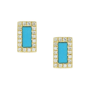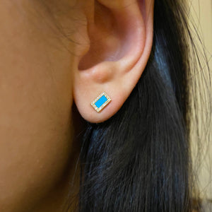 These rectangle-shaped turquoise studs are surrounded by mini diamonds in 14k yellow gold. Turquoise is said to bring out calmness, creativity, and positive thinking. Wear them on their own, or pair with our other huggies and studs for a fun ear stack.