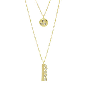 This is one of our favorite necklaces. This necklace has one clasp with two layers - the top layer falls at 20 inches. The stones are raw diamond slices, set in gold-plated 925 sterling silver. Wear with a t-shirt for a beachy-boho look, or with a blazer or deep-V jumpsuit to spice up your workday.