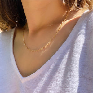 Just in! This paperclip link chain necklace in 14k gold is the perfect necklace to up your style. It is 18 inches, but can be fastened to any link to be any length shorter. It can be worn short like a choker, or a long layered necklace. Perfect for pairing with our other charm necklaces, or wearing on its own!