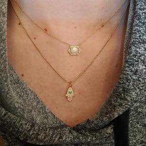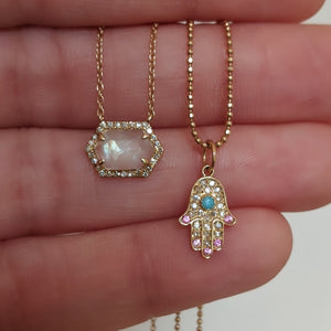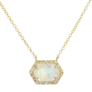 This Rainbow Moonstone Hex Necklace With Diamonds is the perfect everyday piece! Its hexagon shape is a fun and modern shape, and is surrounded by mini diamonds in 14k yellow gold. Rainbow moonstone is said to bring out harmony, balance, and hope. Its brilliant colors flash in different angles of the light.