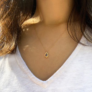This is the perfect sized mini labradorite pear necklace surrounded by mini diamonds. Labradorite is said to promote wisdom and intuition. Wear this necklace on its own, or layer it with some of our delicate chains or necklaces! Adjustable chain from 16, 17, and 18 inches.