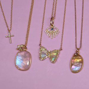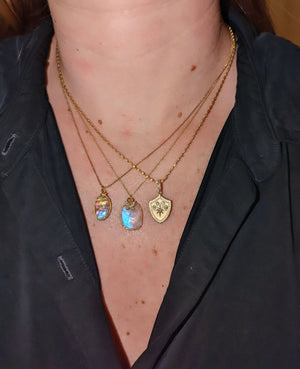 This is the perfect sized rainbow moonstone necklace with an irregular shape. It is layered with a mini starburst charm with a diamond. Moonstone is said to promote positive well-being and balance. Wear this necklace on its own, or layer it with some of our delicate chains or necklaces!