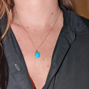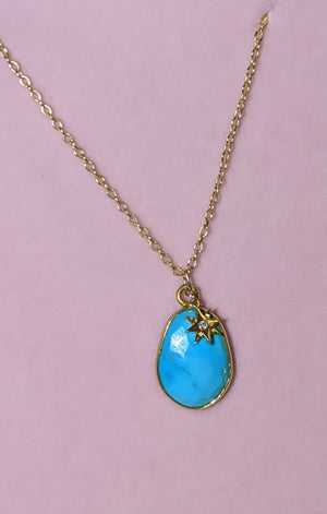 This is the perfect sized turquoise moonstone necklace with an irregular shape. It is layered with a mini starburst charm with a diamond. Moonstone is said to promote ancient wisdom, serenity, and hope. Wear this necklace on its own, or layer it with some of our delicate chains or necklaces!