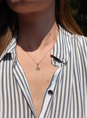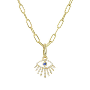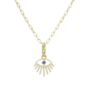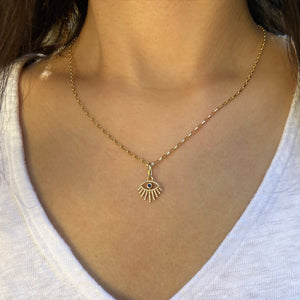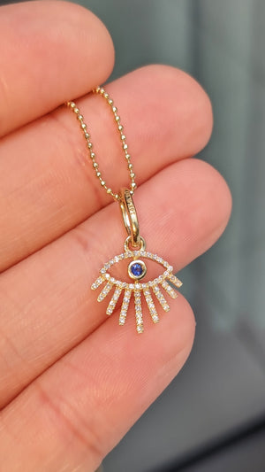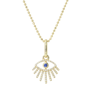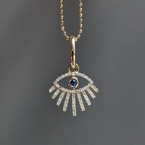 Wow, we love this necklace. It's small enough to be considered a charm, but substantial enough to be worn as a pendant. It is made with solid 14k yellow gold, diamonds, and a blue sapphire. Rays of light beam down, symbolizing wisdom and kindness.