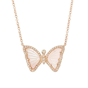 Stunning, this Pink Mother-of-Pearl Butterfly Necklace is set with mini diamonds. It is a truly stunning piece. The diamonds add just the perfect amount of sparkle! The pearl has a subtle pink hue and is shimmery. Butterflies represent hope and transformation.
