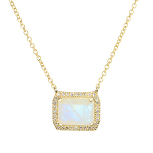This Atiena Rainbow Moonstone Necklace With Diamonds is a must have! The moonstone has flashes of different rainbow colors in the light. It is an emerald-cut, giving it a rectangular shape for a modern and classy feel. The moonstone is surrounded with diamonds for an additional sparkle and is set in 14k yellow gold.