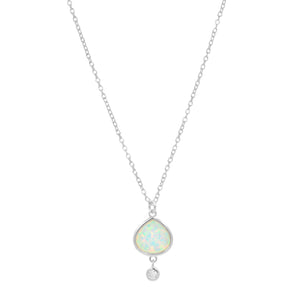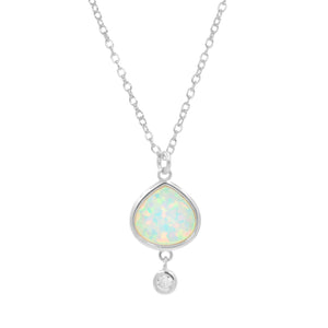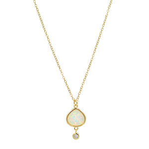 Fun, elegant, and classy, this lab-created 10mm pear shaped opal pendant has a 3mm bezeled crystal drop. The white opal is soft and shimmery, picking up different rainbow colors in the light. It is set in 925 Sterling silver with gold plate. The 18 inch chain is Sterling silver with an adjustable slider ball so it can be shortened to any length! Wear it on its own, or layer Best Friend with our other lab-created opal necklaces.