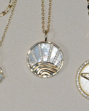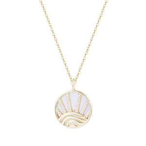 A beautiful medallion necklace with a sunset over the ocean, set with crystals and white mother-of-pearl inlay backing. This lovely necklace is a standout on its own, yet can be worn every day! This comes with an adjustable slider so that it can be worn any size up to 18 inches.