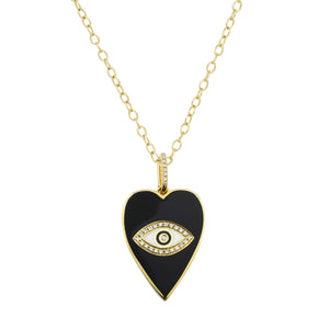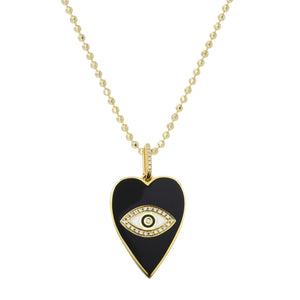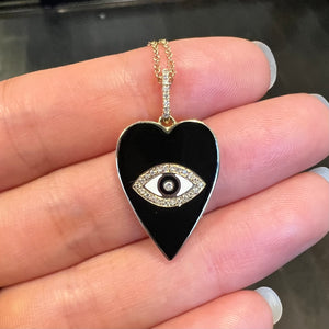This is a large, beautiful black and white enamel heart charm necklace with diamonds and an evil eye in the center. The bail is studded in diamonds for an extra sparkle. Available in plain cable chain, a sparkly diamond-cut ball chain, and the bold paperclip link chain.