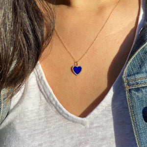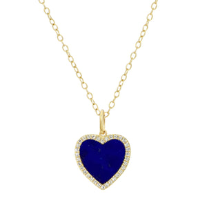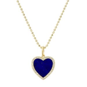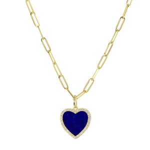 Beautiful blue lapis heart charm necklace with diamonds. Lapis lazuli is a beautiful deep blue stone that is said to bring forth wisdom and self-expression. Available in 18" plain cable chain, a sparkly diamond-cut ball chain, and the bold paperclip link chain.