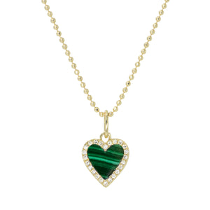 Beautiful malachite heart charm with diamonds. Available in plain cable chain, a sparkly diamond-cut ball chain, and the bold paperclip link chain.