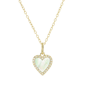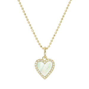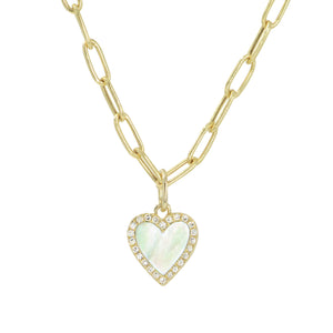 Beautiful mini mother of pearl heart charm with diamonds. Available in plain cable chain, a sparkly diamond-cut ball chain, and the bold paperclip link chain.