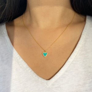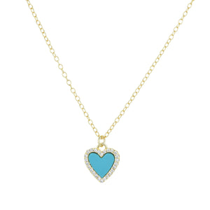Lab-created Turquoise heart necklace surrounded by sparkling crystals. Set in 925 Sterling silver and plated in gold.  Wear alone everyday or add to other layering pieces for a pop of color. The chain is 925 Sterling silver and is adjustable from choker length to 18 inches with slider ball.