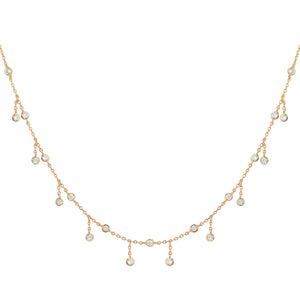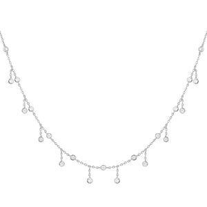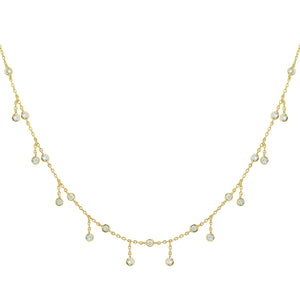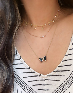 This is the best layering necklace. It is a lovely and simple layering piece can be worn everyday, dropping with tons of sparkle. Sterling silver necklace with high-quality crystals. Adjustable chain from 16-inches to 18-inches. Plating options available in 14kt gold, rose gold, and silver.