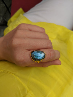 After months of perfecting, we finally arrived at the perfect ring.  A large labradorite cocktail ring set in 925 Sterling silver. Casual, stunning, stackable! Do to the natural state of the stone, the color and patterns may vary.