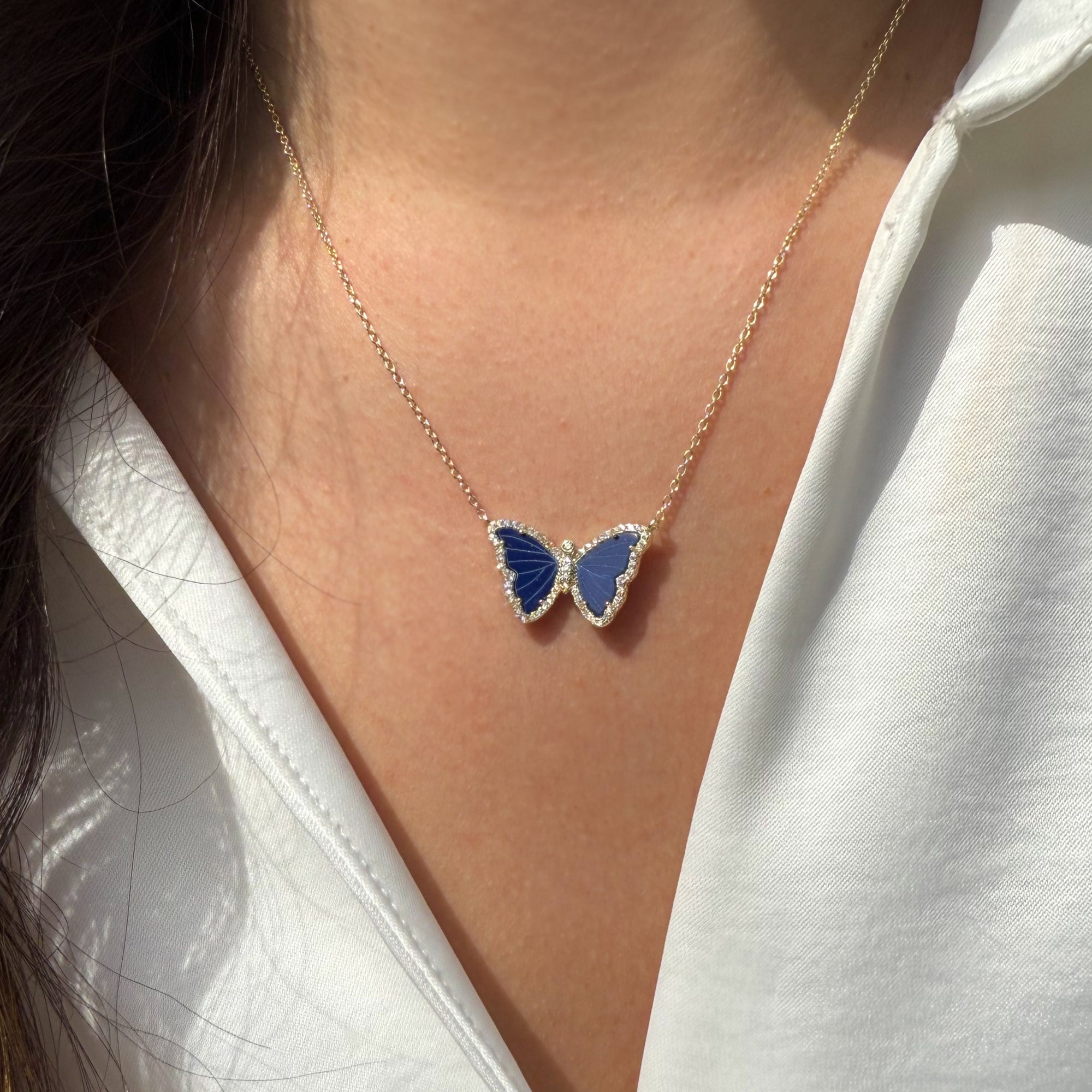 New! The most beautiful and delicate butterfly necklace is now available with lab-created blue lapis lazuli and set in 925 sterling silver. The butterfly wings are surrounded with pave crystal for an added sparkle. Butterflies represent hope, rebirth, and transformation. Pair this necklace with our crystal chokers or your favorite gold chain for a fun layered look. <3