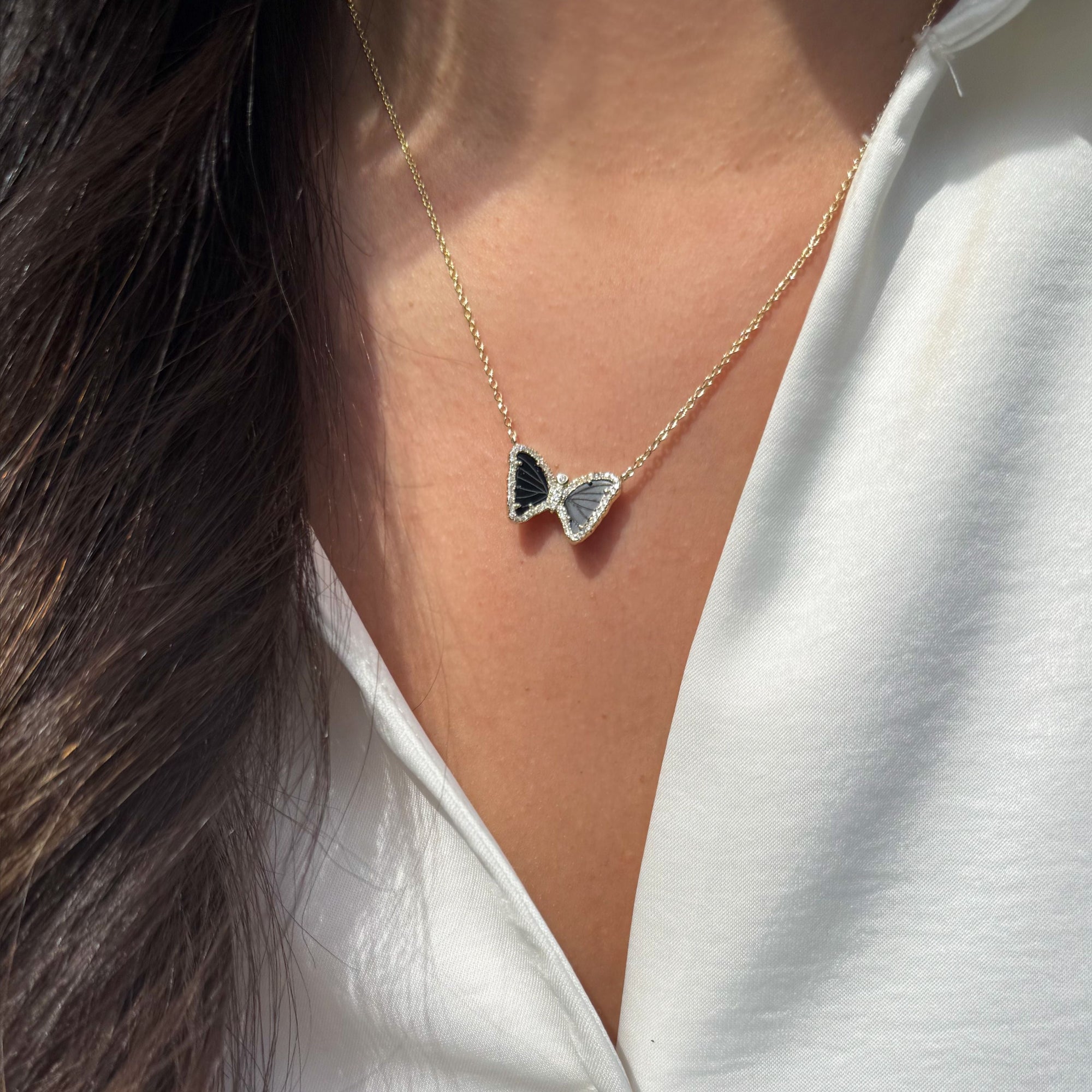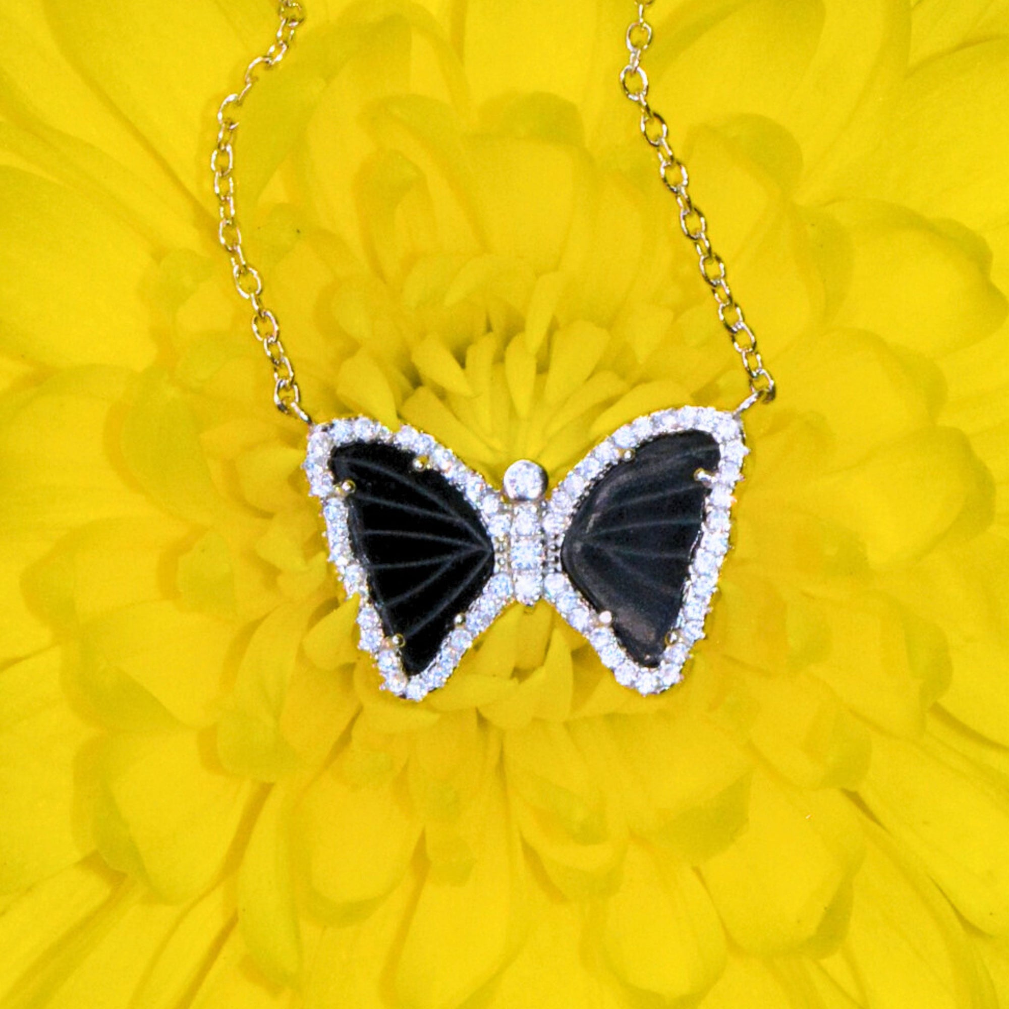 This Mini Butterfly Necklace in Black Onyx has hand-carved genuine black onyx butterfly wings set in gold-plated 925 sterling silver. Black butterflies are seen as symbols of positive change and new beginnings.
