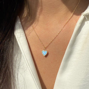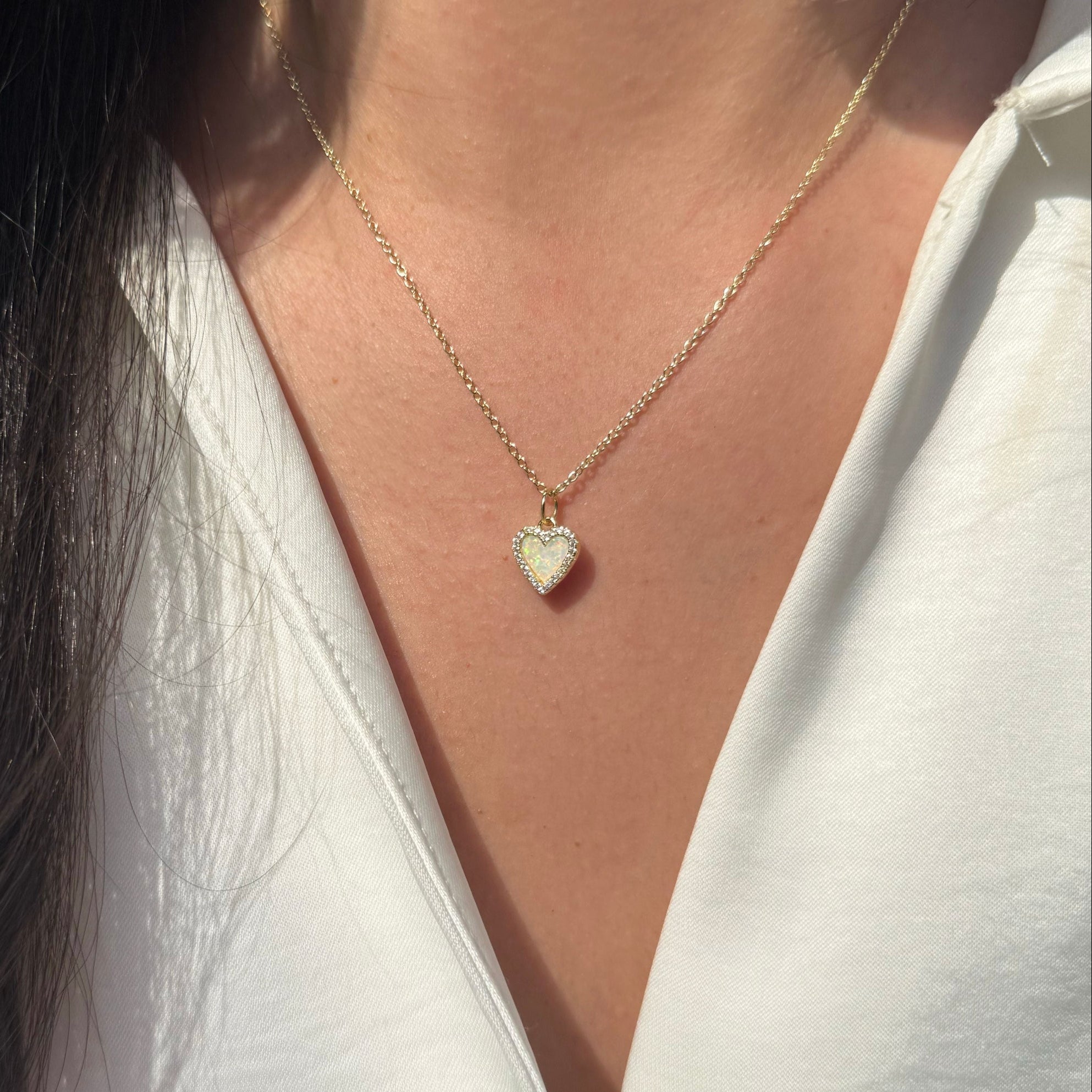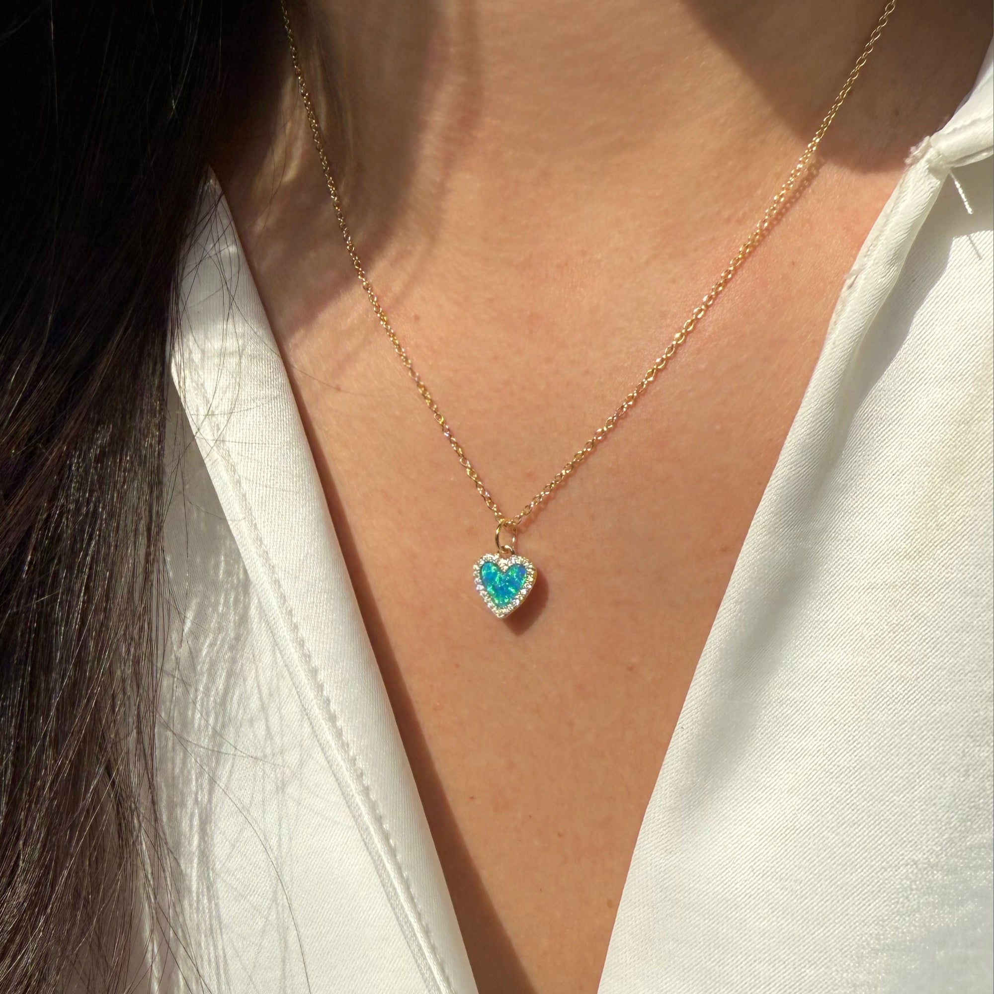 Lab-created round opal heart necklace surrounded by sparkling crystals. Set in 925 Sterling silver and plated in gold. Wear alone everyday or add to other layering pieces for a pop of color.The chain is 925 Sterling silver and is adjustable from choker length to 18 inches with slider ball.
