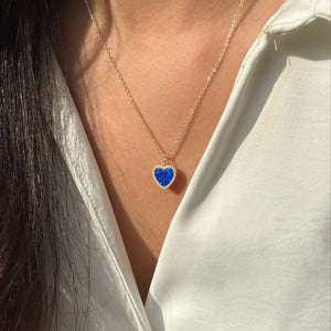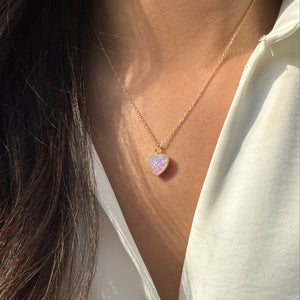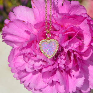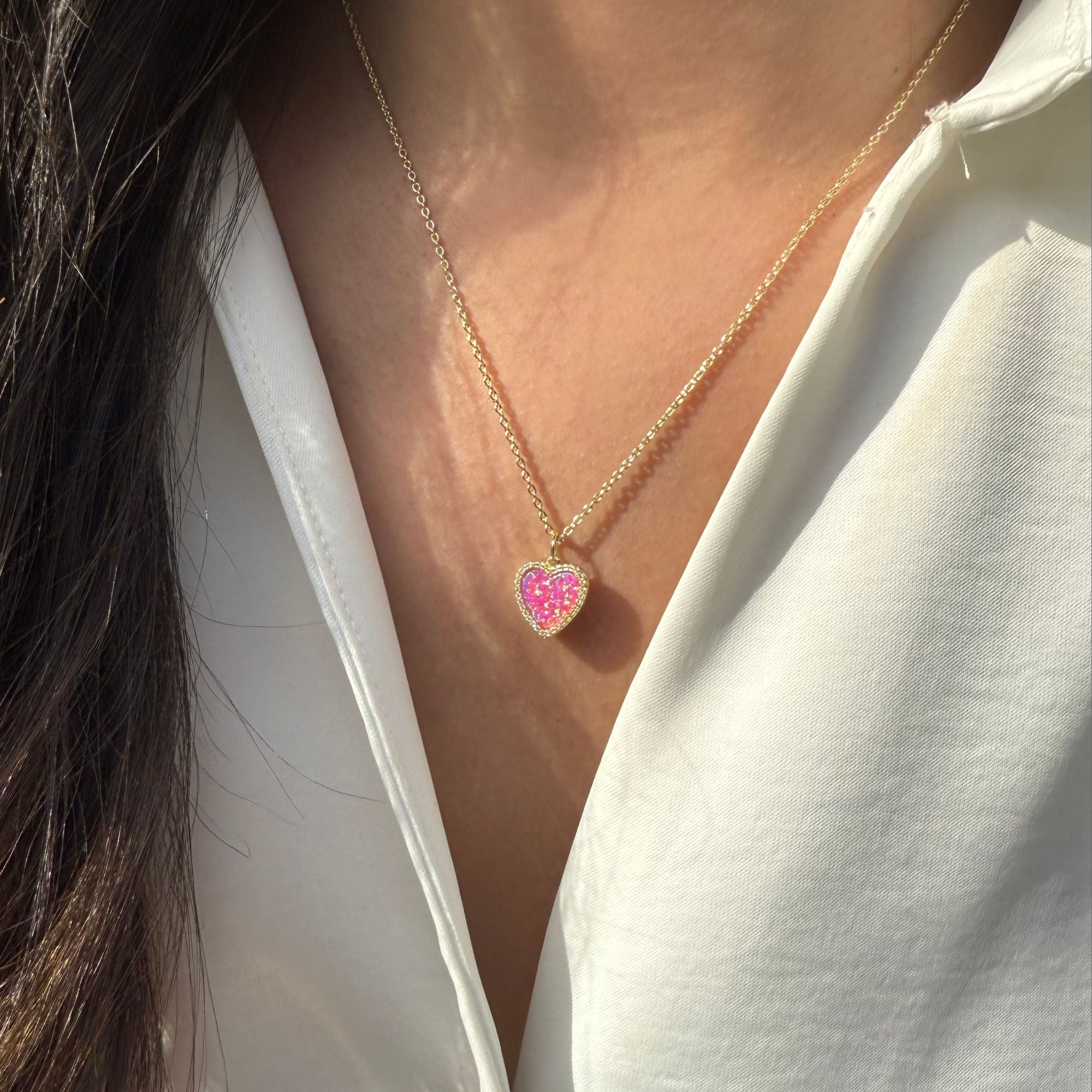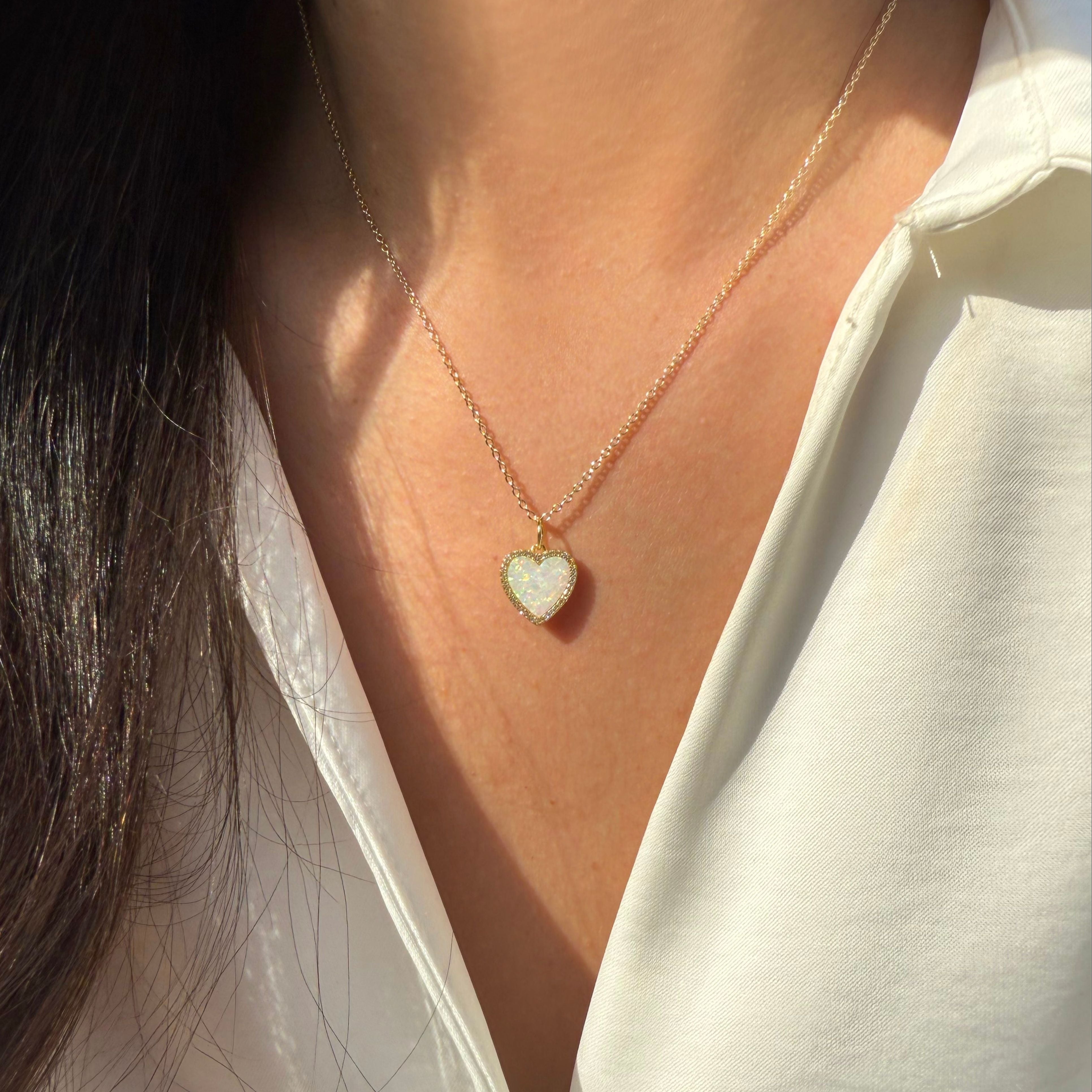 This radiant necklace features a luminous opal heart, its shifting colors framed by a sparkling halo of cubic zirconia. The play of light within the opal symbolizes depth and emotion, while the CZ accents add brilliance and elegance.