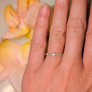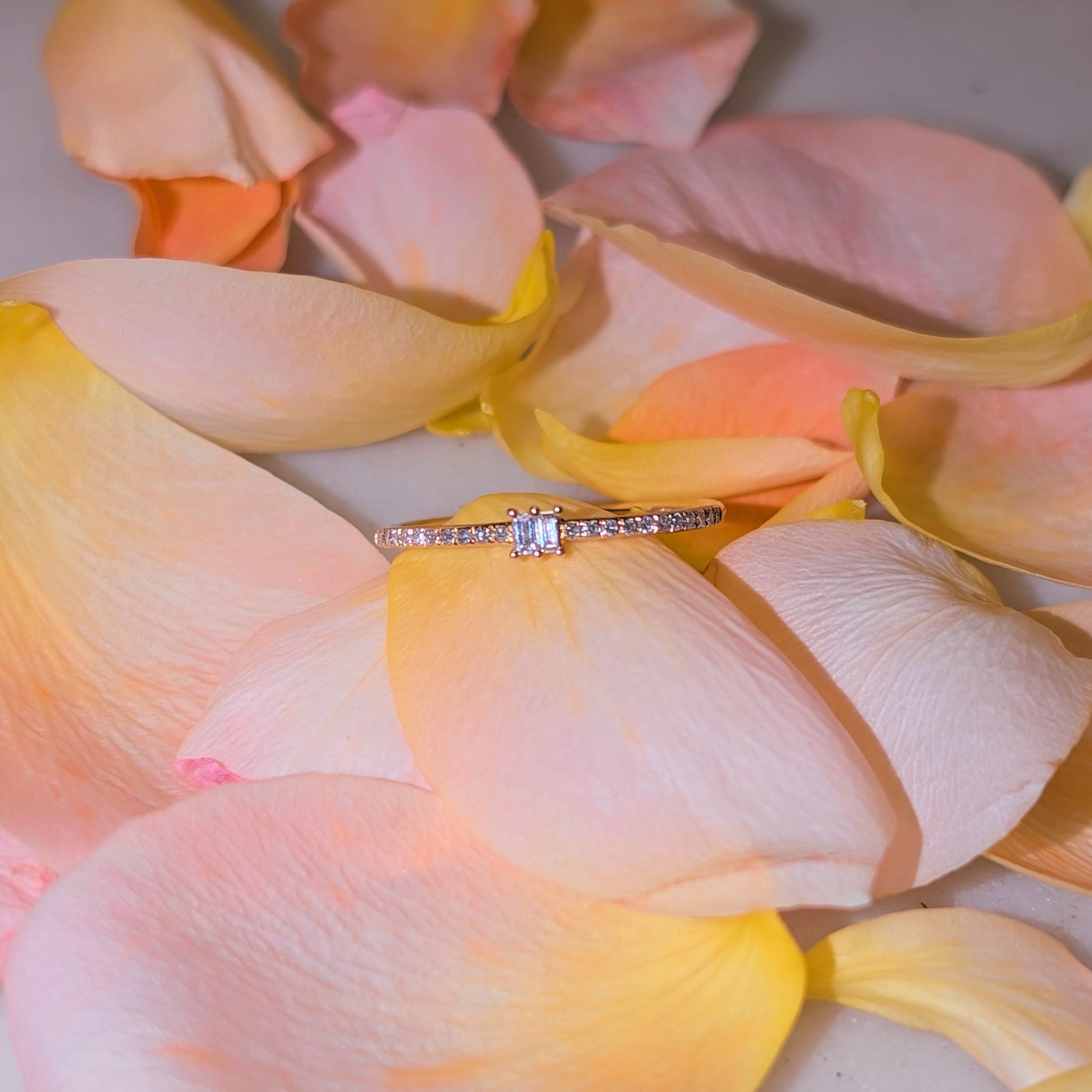 New! This is one of those rings you never seem to take off. Made with a two baguette diamonds and solid 14k yellow gold, this ring is sweet, flirty, and sparkly. The band is thin, yet strong and perfect for stacking. This ring is a size 6.5 We can custom make this ring in any size. For a request, please email us at contact@kamaria.com.