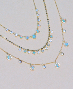 Celestial shimmer, grounded in beauty. Inspired by the mystique of the cosmos, the Drops of Jupiter Necklace features lab-grown opals surrounded by cubic zirconia that sparkle like distant stars. Each stone is thoughtfully placed along a fine chain to evoke the feeling of planets in orbit or falling stardust - glowing, weightless, and full of wonder.