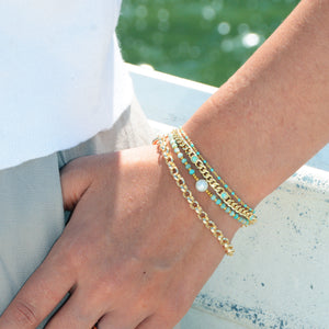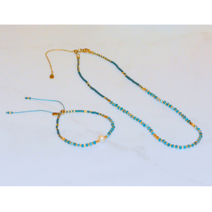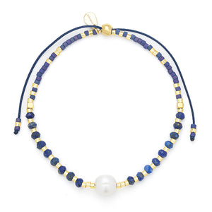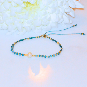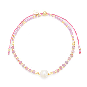 This design features a soft mix of mini faceted gemstones and Japanese Miyuki beads, strung with care and finished with a luminous freshwater pearl at its center. The palette offers a hint of playfulness, while the pearl adds a touch of timeless elegance.