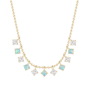 This ethereal necklace features alternating lab-grown opals and brilliant cubic zirconia, each nestled in delicate star-shaped prongs that glimmer like a constellation. Set along a refined ball chain, the stones seem to float - like points of light suspended in a quiet night sky.