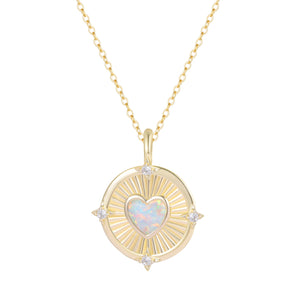 Love at the center. Light all around. This vintage-inspired pendant features a glowing opal heart set at the center of a round, fluted disk - designed to catch and reflect the light from every angle. Surrounding the heart are four twinkling star-set cubic zirconia, like tiny constellations orbiting a luminous core.