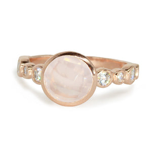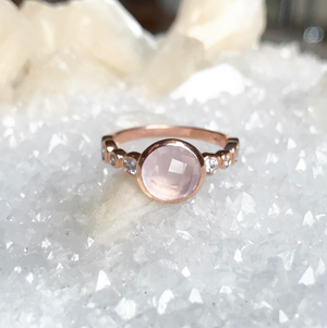 Rose cut rose quartz ring set in 925 Sterling silver with 4 large bezel set crystals down each side and plated in rose gold.