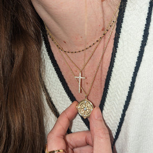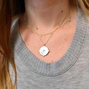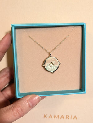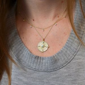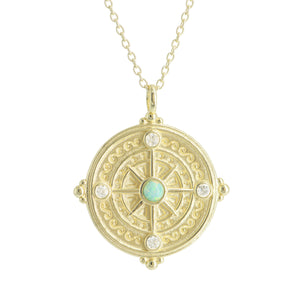 Beautiful compass rose medallion necklace with a lab-grown opal set in 925 Sterling silver and crystals accenting the North, South, East and West directions. The compass symbolizes direction and guidance.